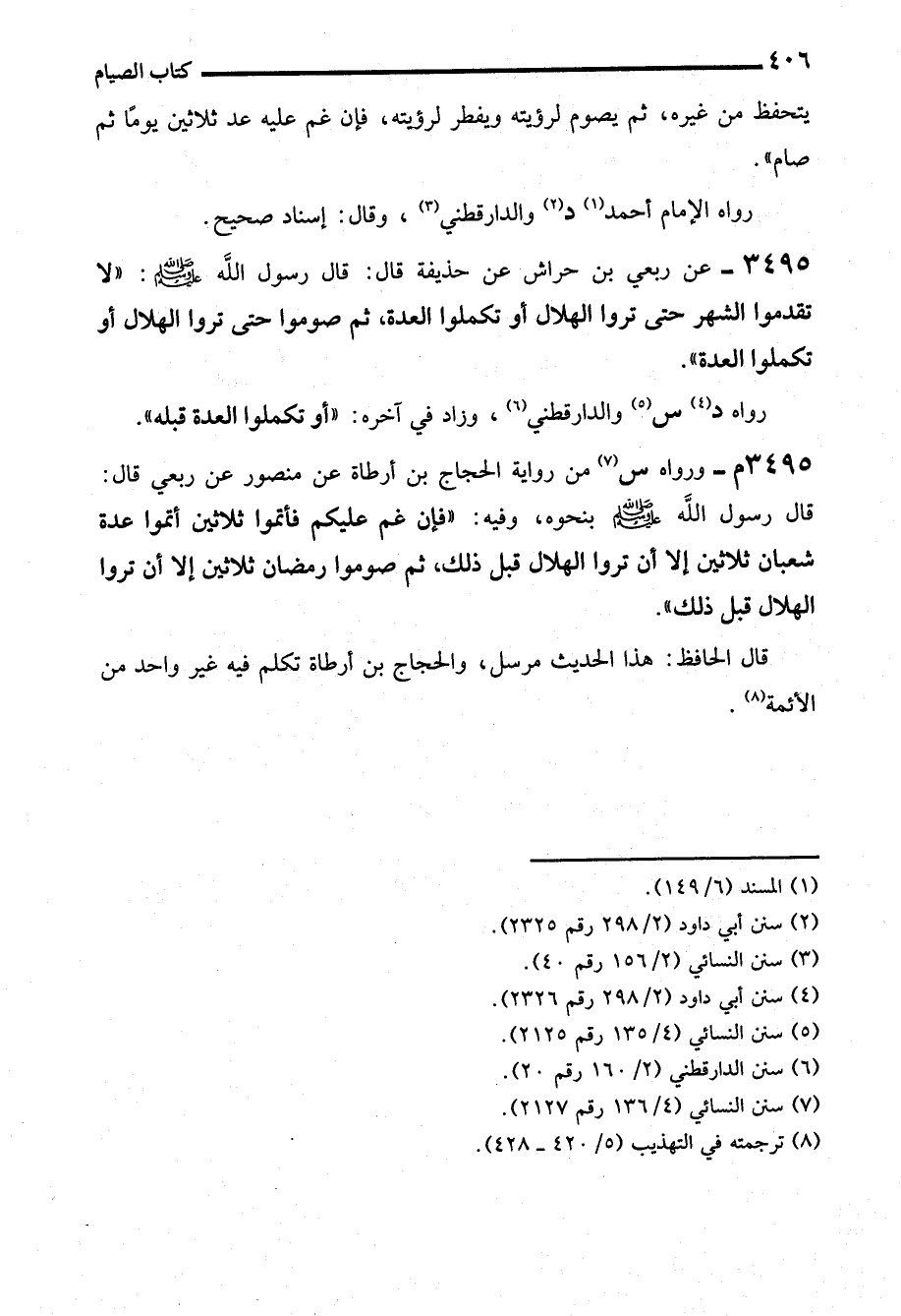 3495م- ورواه س (¬7) من رواية الحجاج بن أرطأة عن منصور عن ربعي قال: قال رسول الله - صلى الله عليه وسلم - بنحوه، وفيه: "فإن غم عليكم فأتموا ثلاثين أتموا عدة شعبان ثلاثين إلا أن تروا الهلال قبل ذلك، ثم صوموا رمضان ثلاثين إلا أن تروا الهلال قبل ذلك".