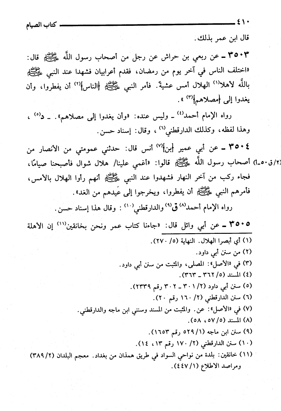 3503 - عن ربعي بن حراش عن رجل من أصحاب رسول الله - صلى الله عليه وسلم - قال: "اختلف الناس في آخر يوم من رمضان، فقدم أعرابيان فشهدا عند النبي - صلى الله عليه وسلم - بالله لأهلا (¬1) الهلال أمس عشيةً. فأمر النبي - صلى الله عليه وسلم - (الناس) (¬2) أن يفطروا، وأن يغدوا إلى (مصلاهم) (¬3) ".