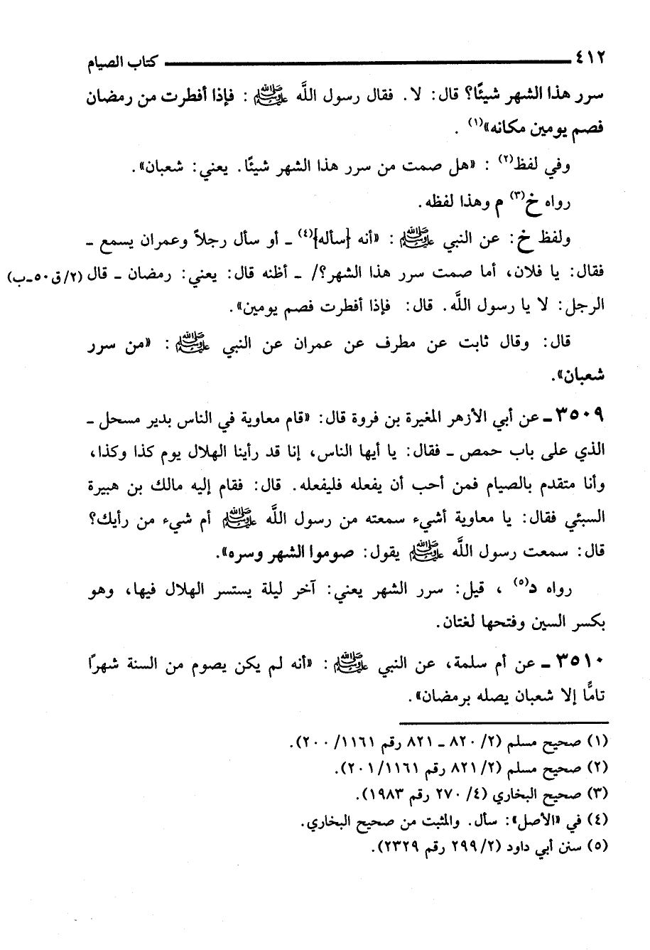 3509 - عن أبي الأزهر المغيرة بن فروة قال: "قام معاوية في الناس بدير مسحل -الذي على باب حمص- فقال: يا أيها الناس، إنا قد رأينا الهلال يوم كذا وكذا، وأنا متقدم بالصيام فمن أحب أن يفعله فليفعله. قال: فقام إليه مالك بن هبيرة السبئي فقال: يا معاوية أشيء سمعته من رسول الله - صلى الله عليه وسلم - أم شيء من رأيك؟ قال: سمعت رسول الله - صلى الله عليه وسلم - يقول: صوموا الشهر وسره".