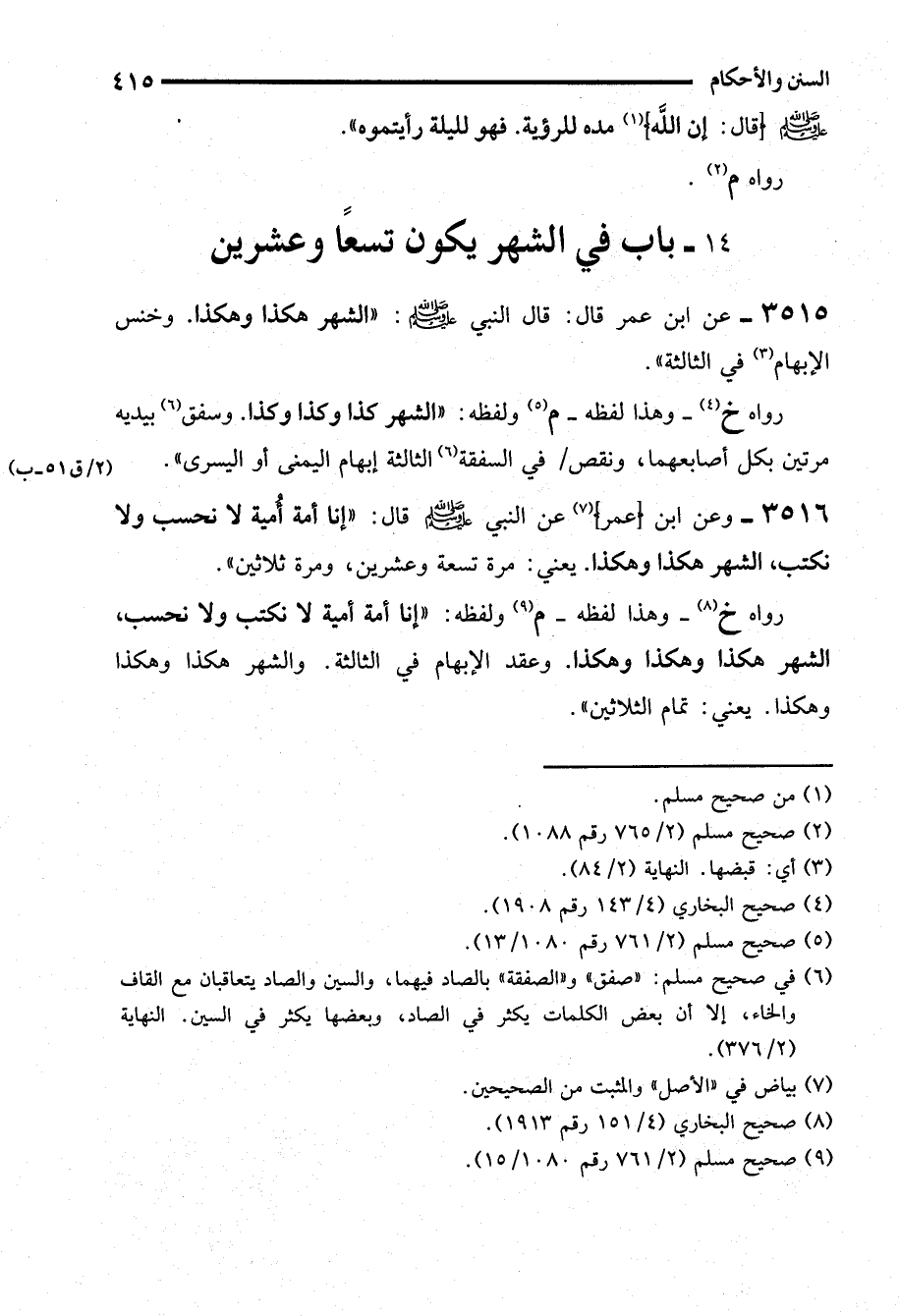 3516 - وعن ابن (عمر) (¬7) عن النبي - صلى الله عليه وسلم - قال: "إنا أمة أُمية لا نحسب ولا نكتب، الشهر هكذا وهكذا. يعني: مرة تسعة وعشرين، ومرة ثلاثين".