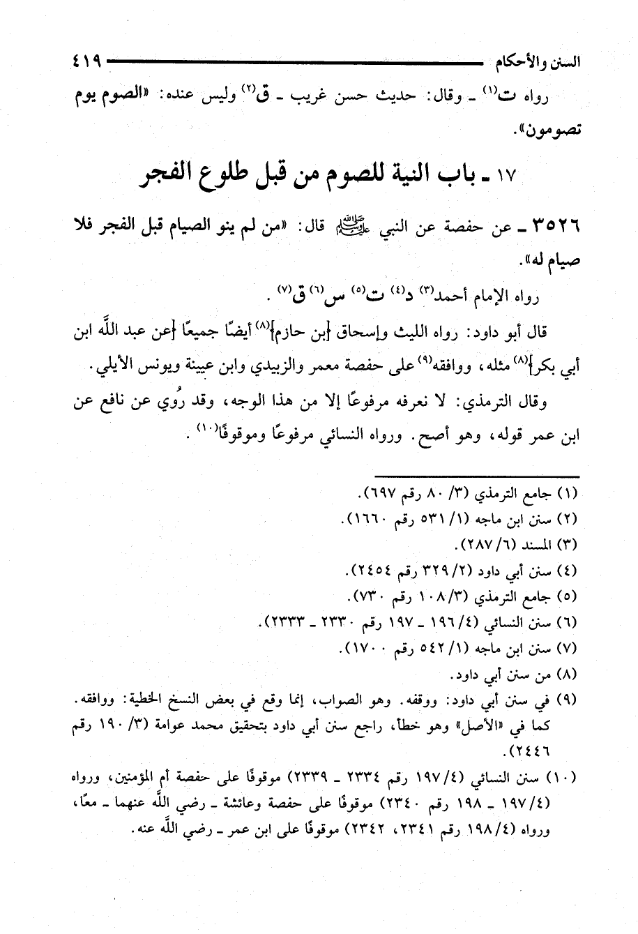 3526 - عن حفصة عن النبي - صلى الله عليه وسلم - قال: "من لم ينو الصيام قبل الفجر فلا صيام له".