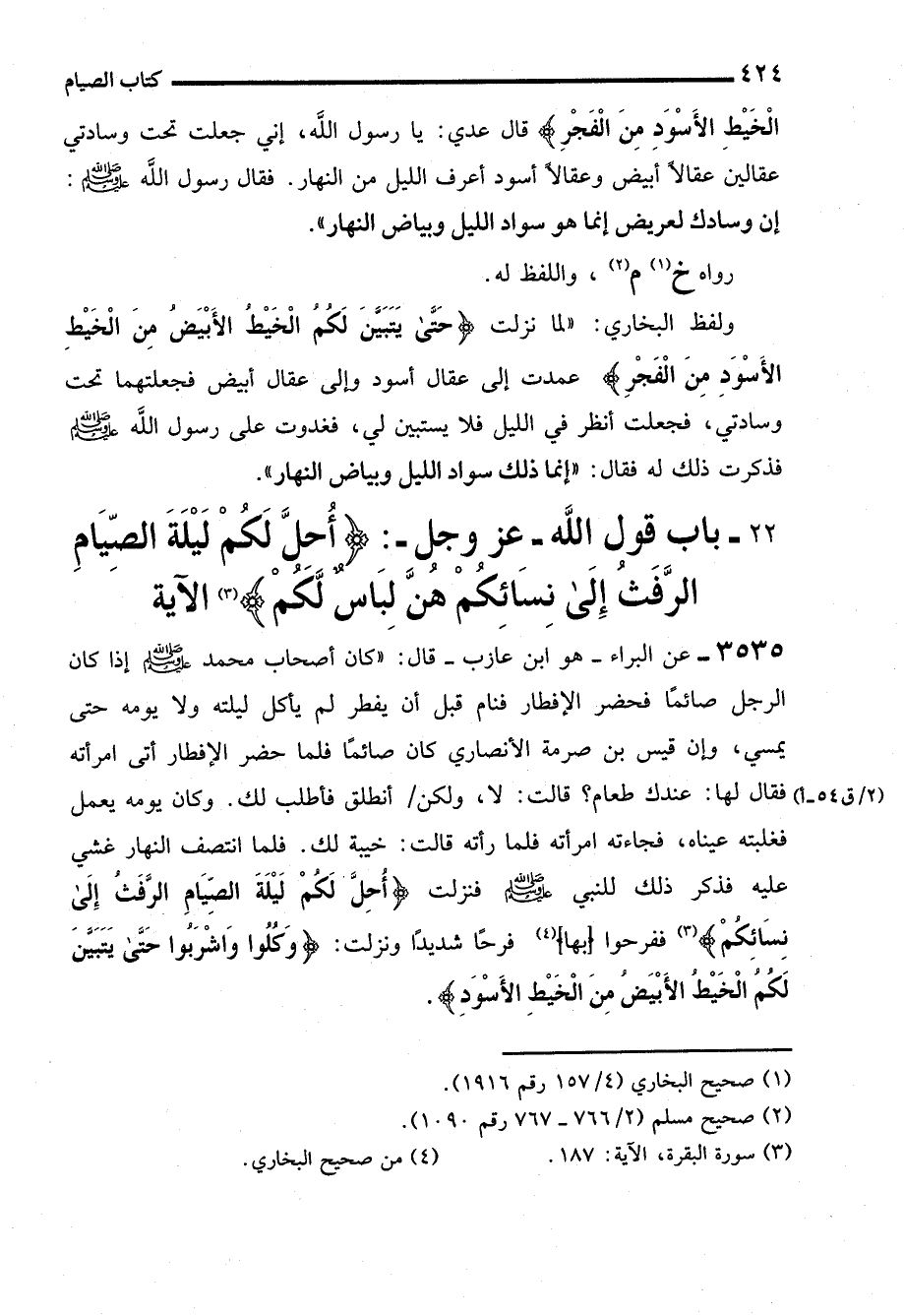 ولفظ البخاري: "لما نزلت {حَتَّى يَتَبَيَّنَ لَكُمُ الْخَيْطُ الْأَبْيَضُ مِنَ الْخَيْطِ الْأَسْوَدِ مِنَ الْفَجْرِ} عمدت إلى عقال أسود وإلى عقال أبيض فجعلتهما تحت وسادتي، فجعلت انظر في الليل فلا يستبين لي، فغدوت على رسول الله - صلى الله عليه وسلم - فذكرت ذلك له فقال: "إنما ذلك سواد الليل وبياض النهار".