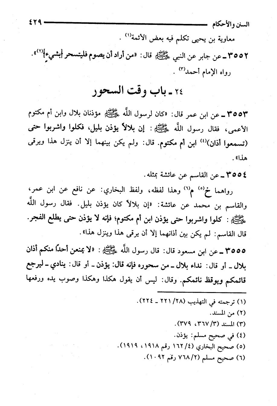 3555 - عن ابن مسعود قال: قال رسول الله - صلى الله عليه وسلم -: "لا يمنعن أحدكم منكم أذان بلال -أو قال: نداء بلال- من سحوره فإنه قال: يؤذن -أو قال: ينادي- ليرجع قائمكم ويوقظ نائمكم. وقال: ليس أن يقول هكذا وهكذا وصوب يده ورفعها