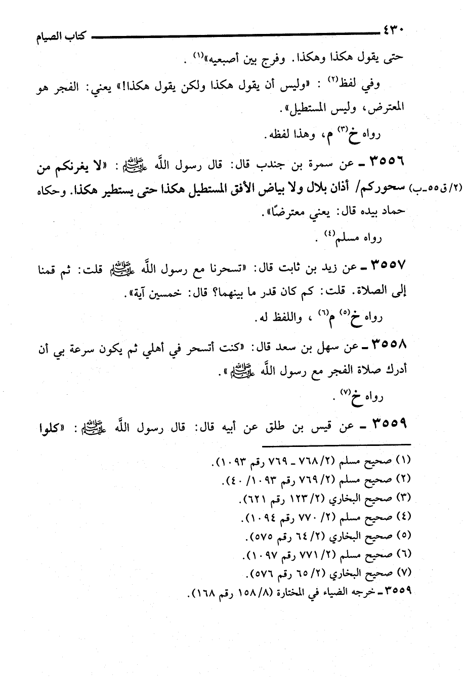 3557 - عن زيد بن ثابت قال: "تسحرنا مع رسول الله - صلى الله عليه وسلم - قلت: ثم قمنا إلى الصلاة. قلت: كم كان قدر ما بينهما؟ قال: خمسين آية".