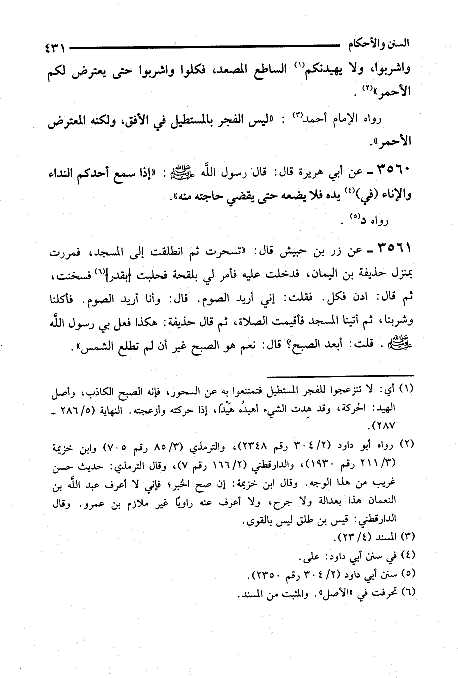 3561 - عن زر بن حبيش قال: "تسحرت ثم انطلقت إلى المسجد، فمررت بمنزل حذيفة بن اليمان، فدخلت عليه فأمر لي بلقحة فحلبت (بقدر) (¬6) فسخنت، ثم قال: ادن فكل. فقلت: إني أريد الصوم. قال: وأنا أريد الصوم. فأكلنا وشربنا، ثم أتينا المسجد فأقيمت الصلاة، ثم قال حذيفة: هكذا فعل بي رسول الله - صلى الله عليه وسلم -. قلت: أبعد الصبح؟ قال: نعم هو الصبح غير أن لم تطلع الشمس".