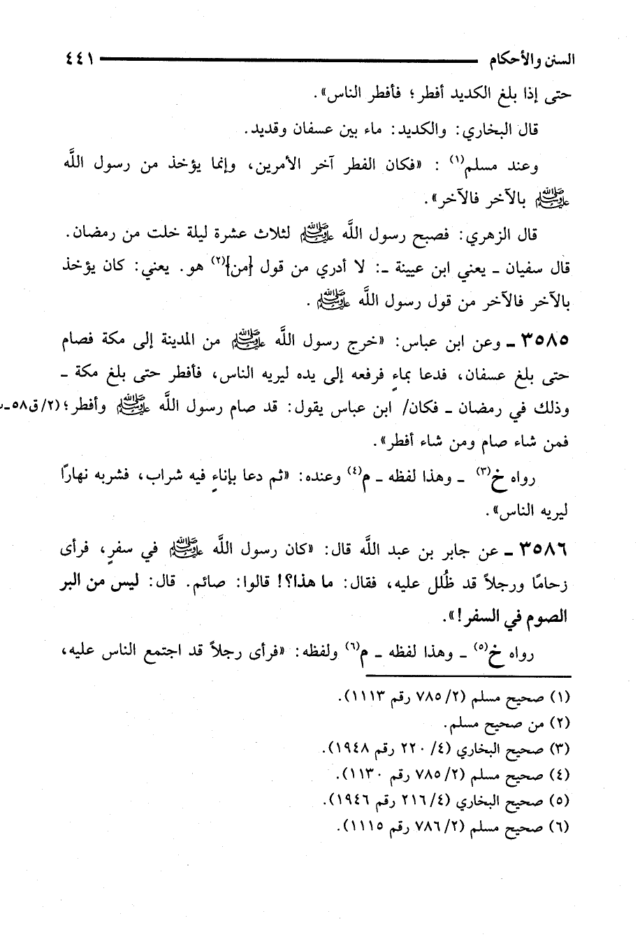 3585 - وعن ابن عباس: "خرج رسول الله - صلى الله عليه وسلم - من المدينة إلى مكة فصام حتى بلغ عسفان، فدعا بماءٍ فرفعه إلى يده ليريه الناس، فأفطر حتى بلغ مكة -وذلك في رمضان- فكان ابن عباس يقول: قد صام رسول الله - صلى الله عليه وسلم - وأفطر؛ فمن شاء صام ومن شاء أفطر".