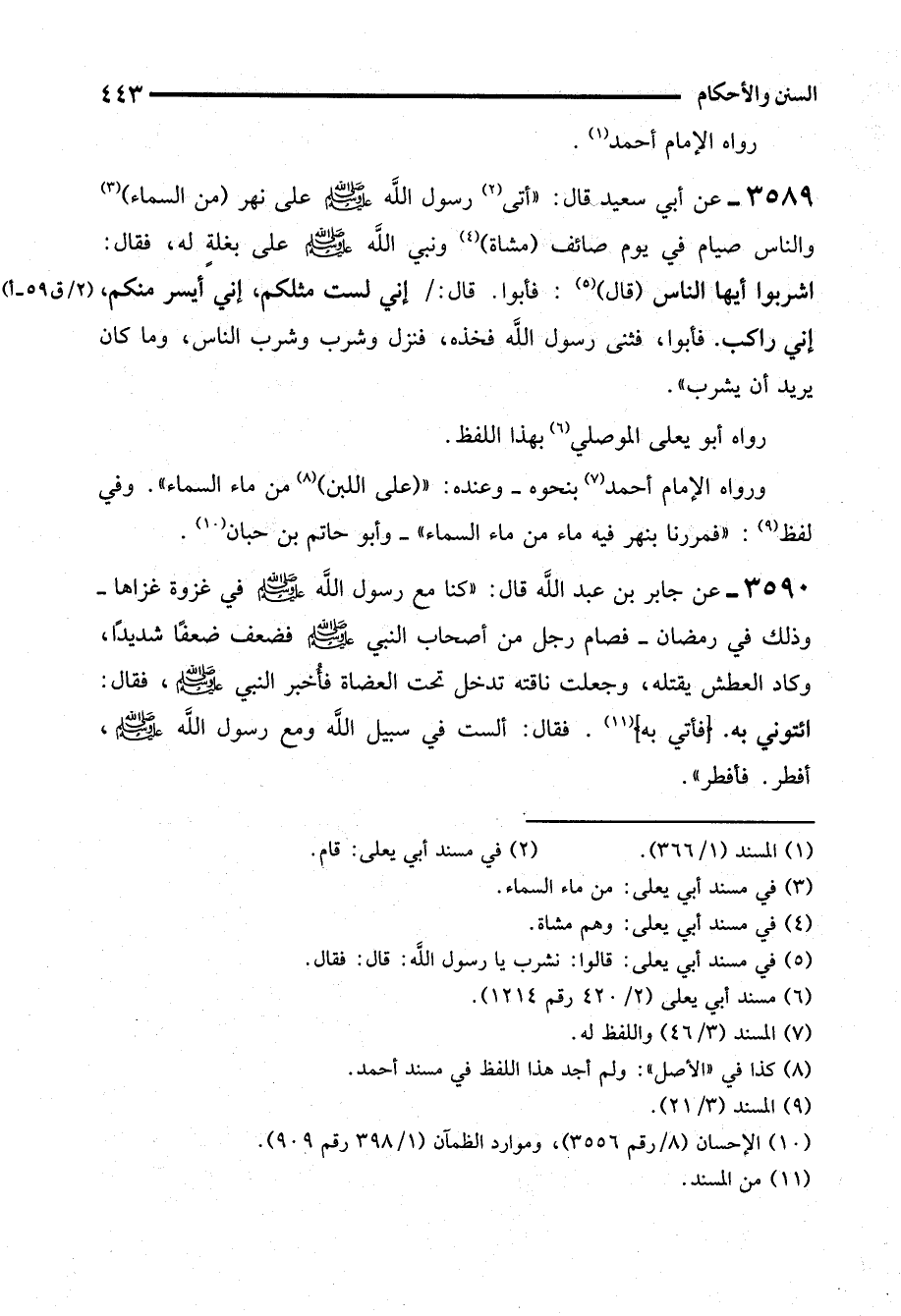 3589 - عن أبي سعيد قال: "أتى (¬2) رسول الله - صلى الله عليه وسلم - على نهر (من السماء) (¬3) والناس صيام في يوم صائف (مشاة) (¬4) ونبي الله - صلى الله عليه وسلم - على بغلةٍ له، فقال: اشربوا أيها الناس (قال) (¬5): فأبوا. قال: إني لست مثلكم، إني أيسر منكم، إني راكب. فأبوا، فثنى رسول الله فخذه، فنزل وشرب وشرب الناس، وما كان يريد أن يشرب".