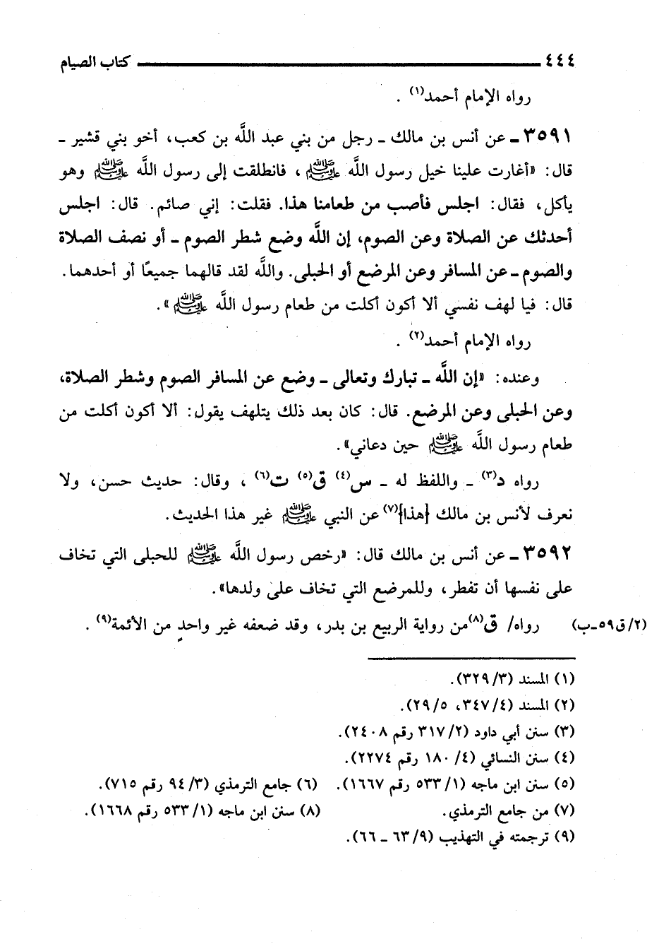 3591 - عن أنس بن مالك -رجل من بني عبد الله بن كعب، أخو بني قشير- قال: "أغارت علينا خيل رسول الله - صلى الله عليه وسلم -، فانطلقت إلى رسول الله - صلى الله عليه وسلم - وهو يأكل، فقال: اجلس فأصب من طعامنا هذا. فقلت: إني صائم. قال: اجلس أحدثك عن الصلاة وعن الصوم، إن الله وضع شطر الصوم -أو نصف الصلاة والصوم- عن المسافر وعن المرضع أو الحبلى. والله لقد قالهما جميعًا أو أحدهما. قال: فيا لهف نفسي ألا أكون أكلت من طعام رسول الله - صلى الله عليه وسلم -".