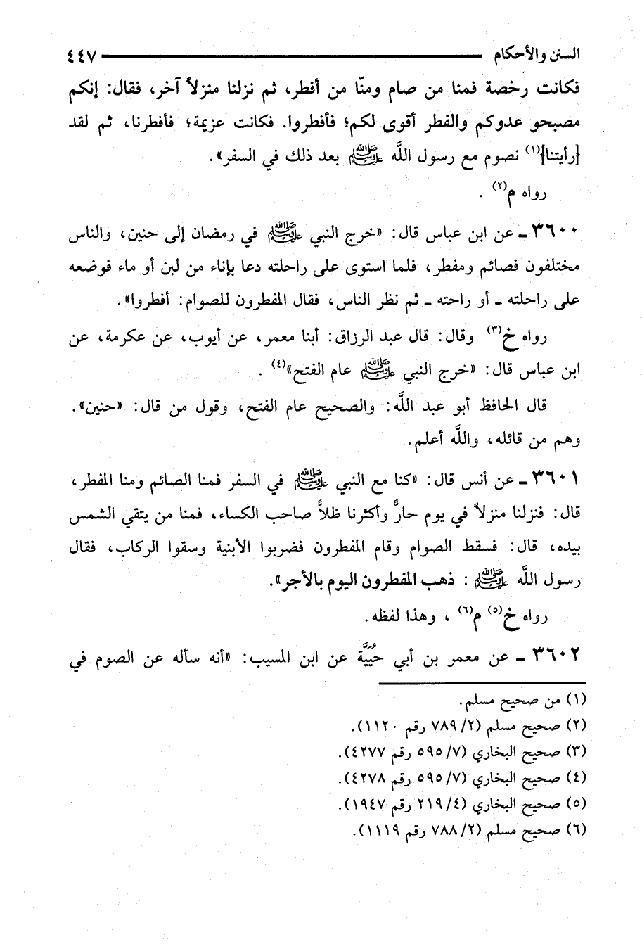 3600 - عن ابن عباس قال: "خرج النبي - صلى الله عليه وسلم - في رمضان إلى حنين، والناس مختلفون فصائم ومفطر، فلما استوى على راحلته دعا بمناء من لبن أو ماء فوضعه على راحلته -أو راحته- ثم نظر الناس، فقال المفطرون للصوام: أفطروا".