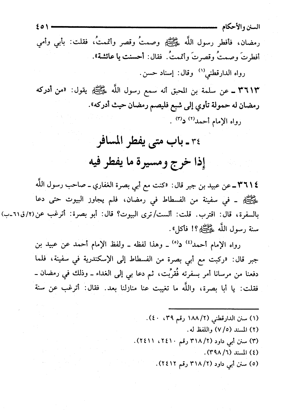 رواه الإمام أحمد (¬4) د (¬5) -وهذا لفظه- ولفظ الإمام أحمد عن عبيد بن جبر قال: "ركبت مع أبي بصرة من الفسطاط إلى الإسكندرية في سفينة، فلما دفعنا من مرسانا أمر بسفرته فُقرِّبت، ثم دعا بي إلى الغداء -وذلك في رمضان- فقلت: يا أبا بصرة، واللَّه ما تغيبت عنا منازلنا بعد. فقال: أترغب عن سنة