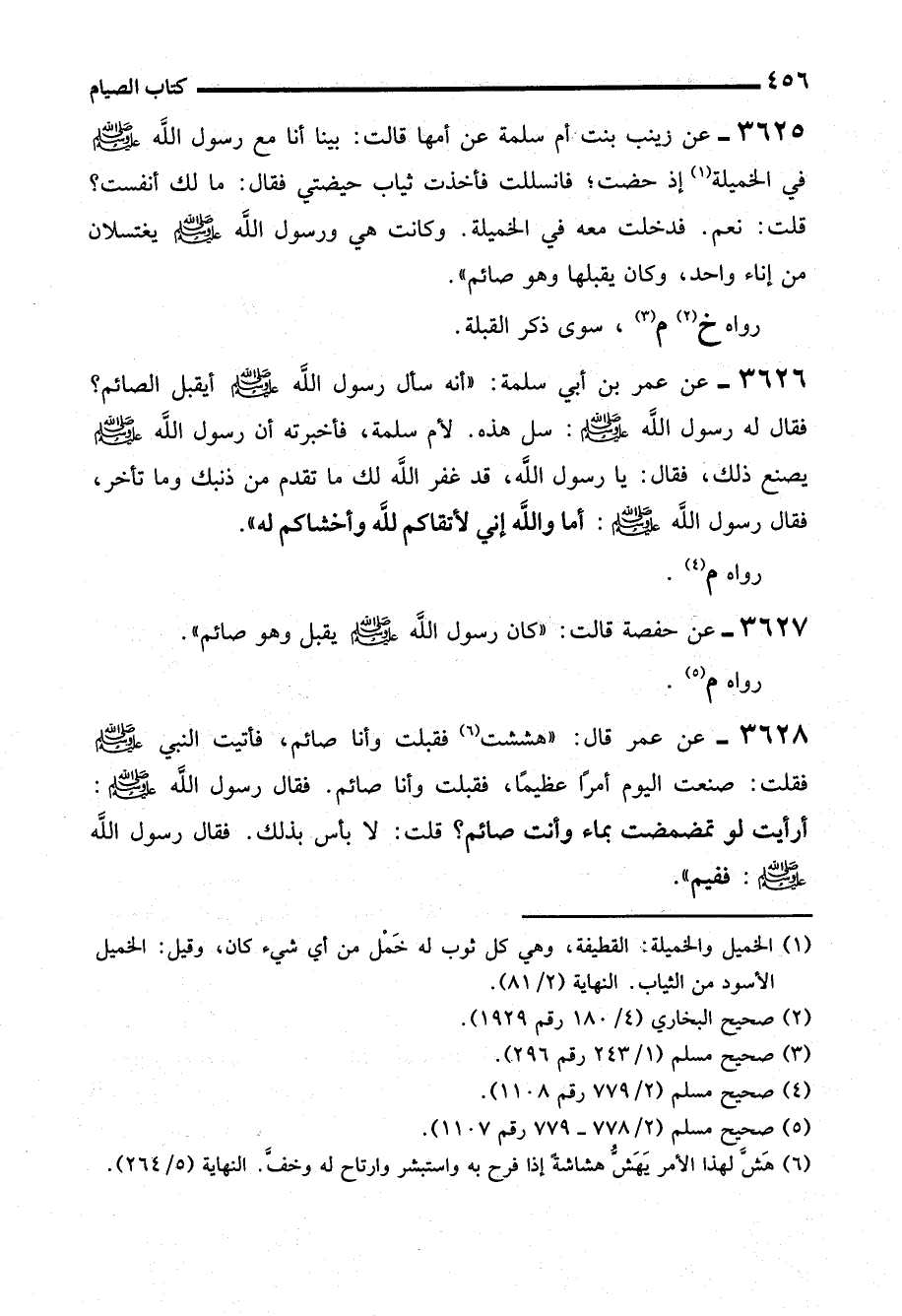 3626 - عن عمر بن أبي سلمة: "أنه سأل رسول الله - صلى الله عليه وسلم - أيقبل الصائم؟ فقال له رسول الله - صلى الله عليه وسلم -: سل هذه. لأم سلمة، فأخبرته أن رسول الله - صلى الله عليه وسلم - يصنع ذلك، فقال: يا رسول الله، قد غفر الله لك ما تقدم من ذنبك وما تأخر، فقال رسول الله - صلى الله عليه وسلم -: أما واللَّه إني لأتقاكم لله وأخشاكم له".