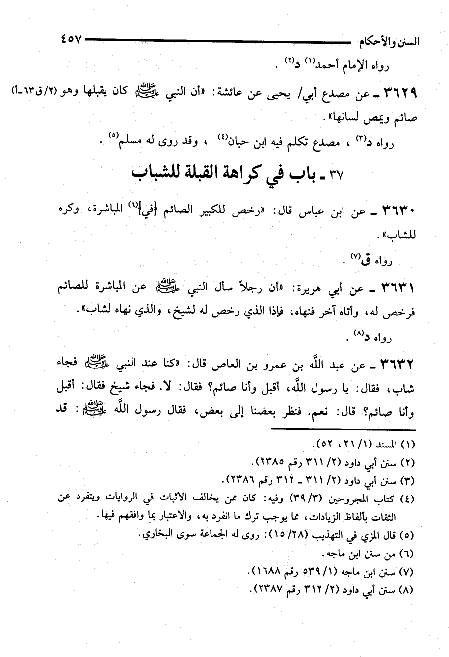 3631 - عن أبي هريرة: "أن رجلاً سأل النبي - صلى الله عليه وسلم عن المباشرة للصائم فرخص له، وأتاه آخر فنهاه، فإذا الذي رخص له لشيخ، والذي نهاه لشاب".