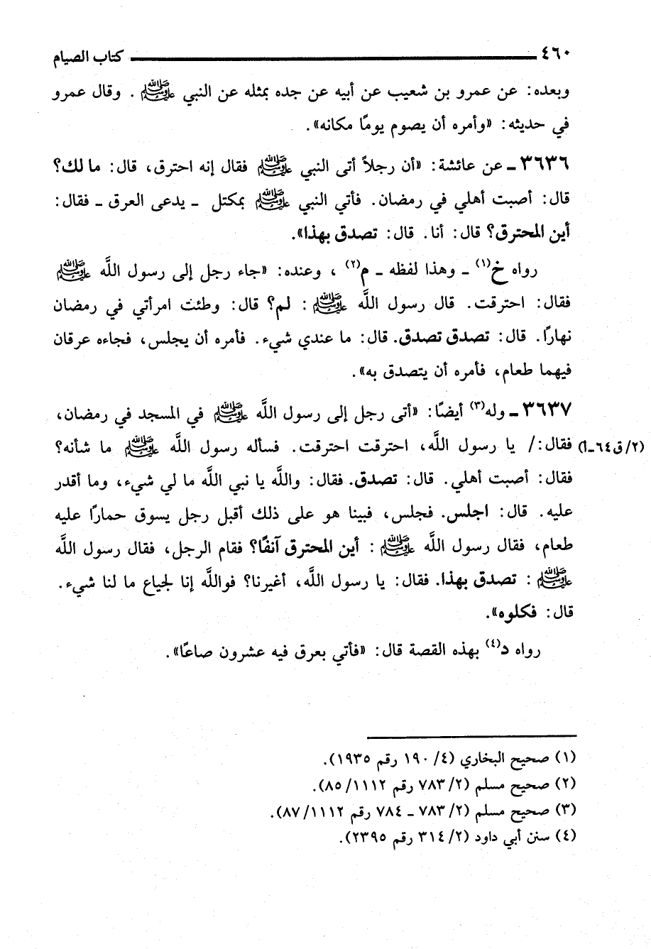 3636 - عن عائشة: "أن رجلاً أتى النبي - صلى الله عليه وسلم - فقال إنه احترق، قال: ما لك؟ قال: أصبت أهلي في رمضان. فأتي النبي - صلى الله عليه وسلم - بمكتل -يدعى العرق- فقال: أين المحترق؟ قال: أنا. قال: تصدق بهذا".