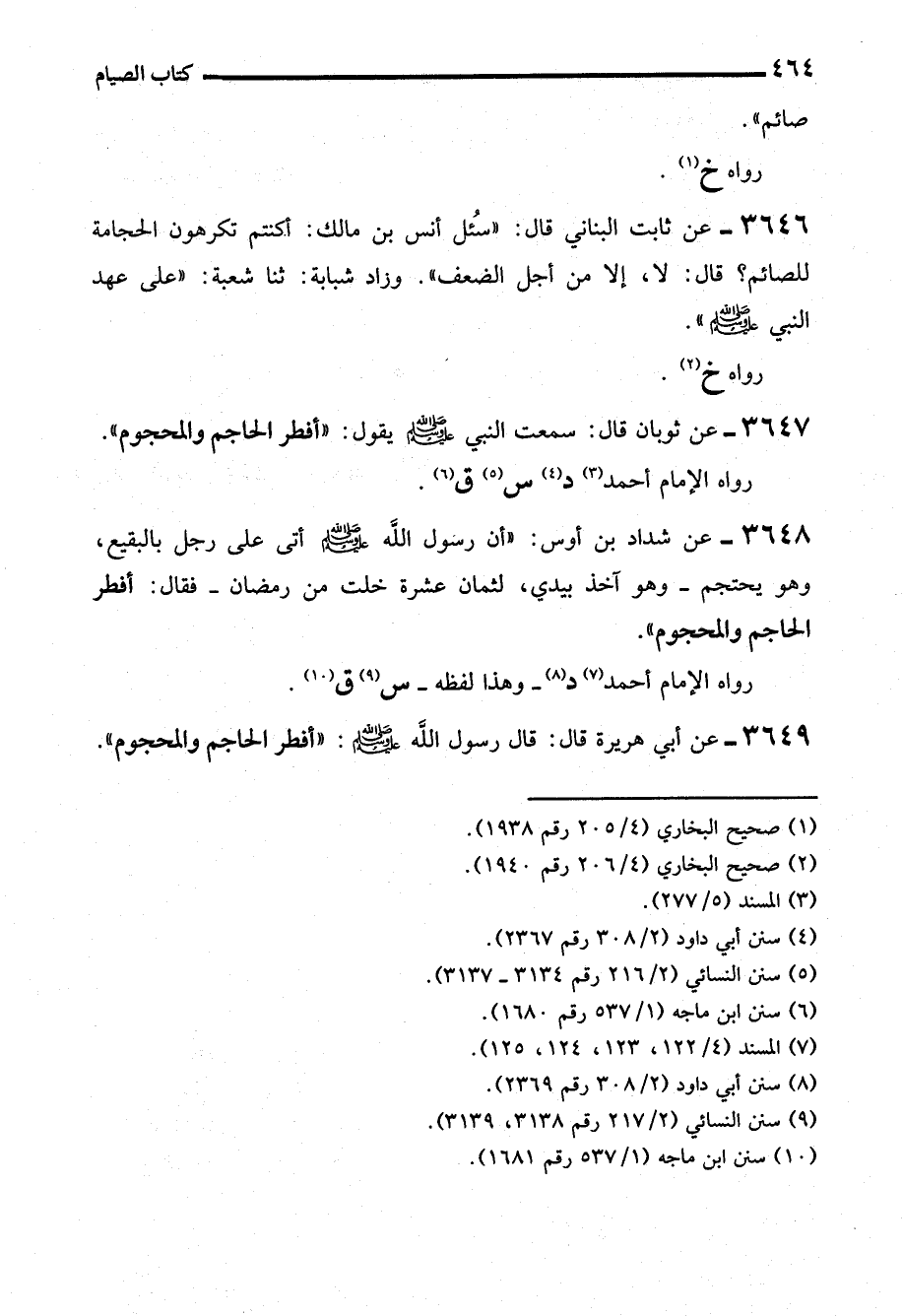 3649 - عن أبي هريرة قال: قال رسول الله - صلى الله عليه وسلم -: "أفطر الحاجم والمحجوم".