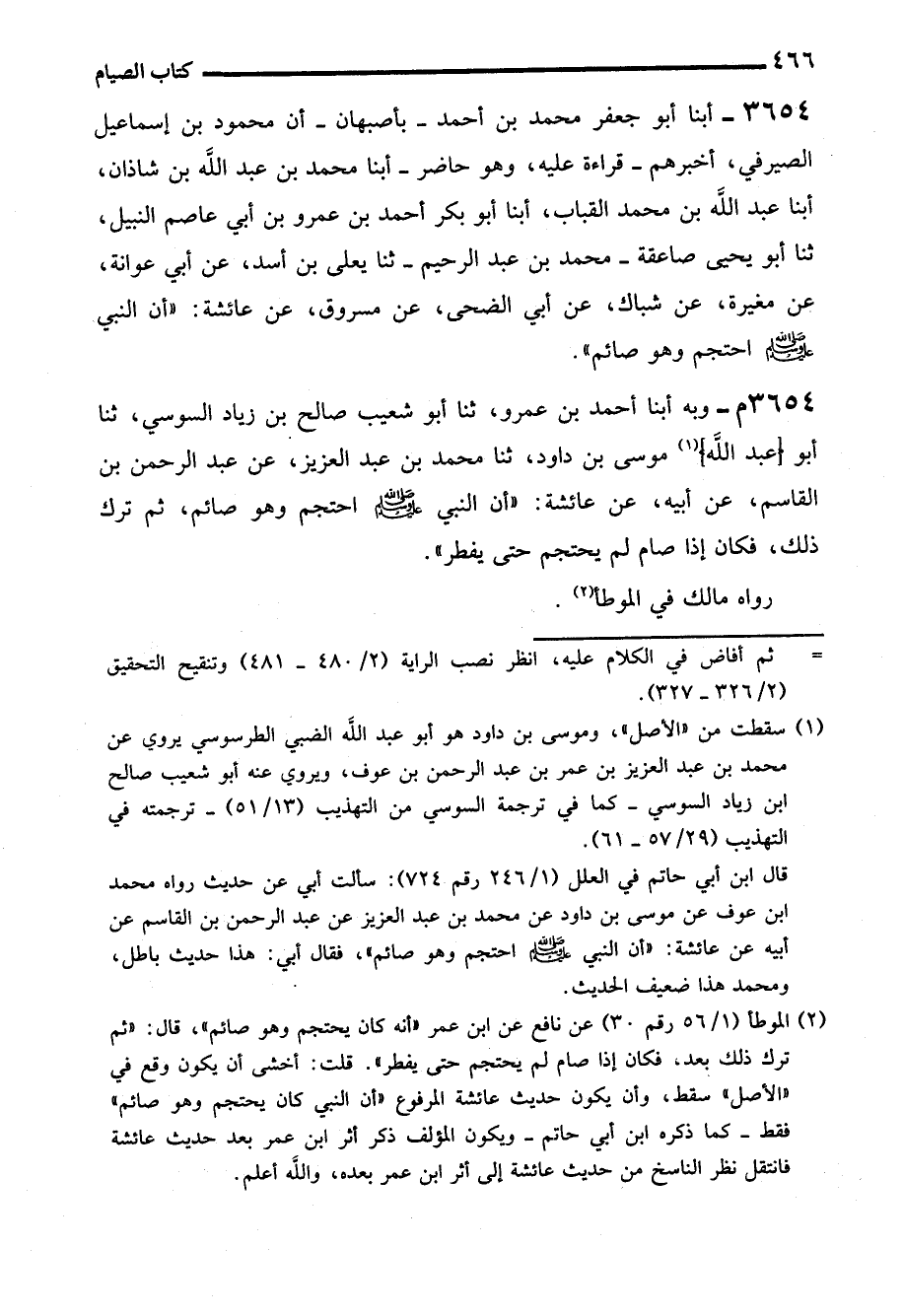 (¬2) الموطأ (1/ 56 رقم 30) عن نافع عن ابن عمر "أنه كان يحتجم وهو صائم"، قال: "ثم ترك ذلك بعد، فكان إذا صام لم يحتجم حتى يفطر". قلت: أخشى أن يكون وقع في "الأصل" سقط، وأن يكون حديث عائشة المرفوع "أن النبي - صلى الله عليه وسلم - كان يحتجم وهو صائم" فقط -كما ذكره ابن أبي حاتم- ويكون المؤلف ذكر أثر ابن عمر بعد حديث عائشة فانتقل نظر الناسخ من حديث عائشة إلى أثر ابن عمر بعده، والله أعلم.