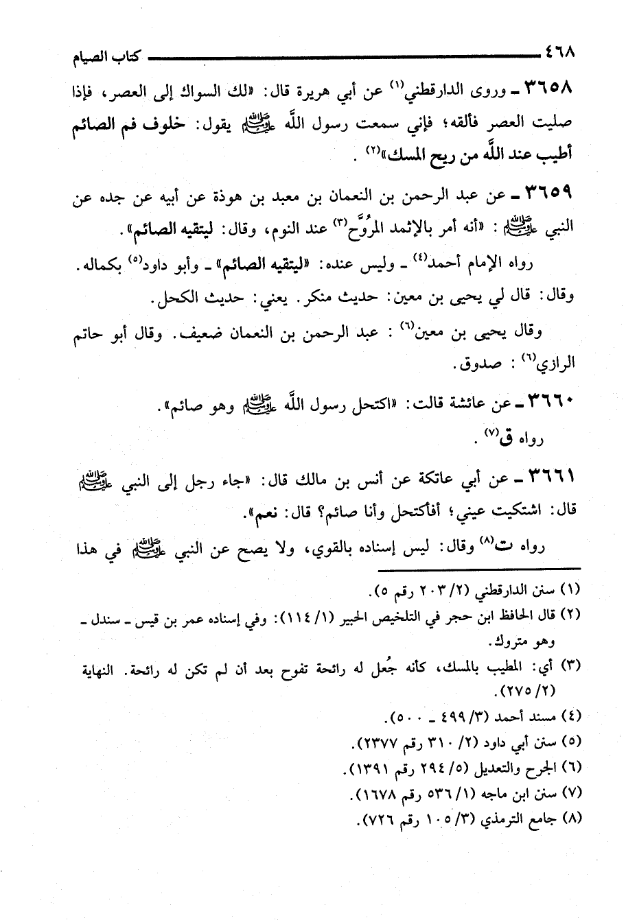 3658 - وروى الدارقطني (¬1) عن أبي هريرة قال: "لك السواك إلى العصر، فإذا صليت العصر فألقه؛ فإني سمعت رسول الله - صلى الله عليه وسلم - يقول: خلوف فم الصائم أطيب عند الله من ريح المسك" (¬2).