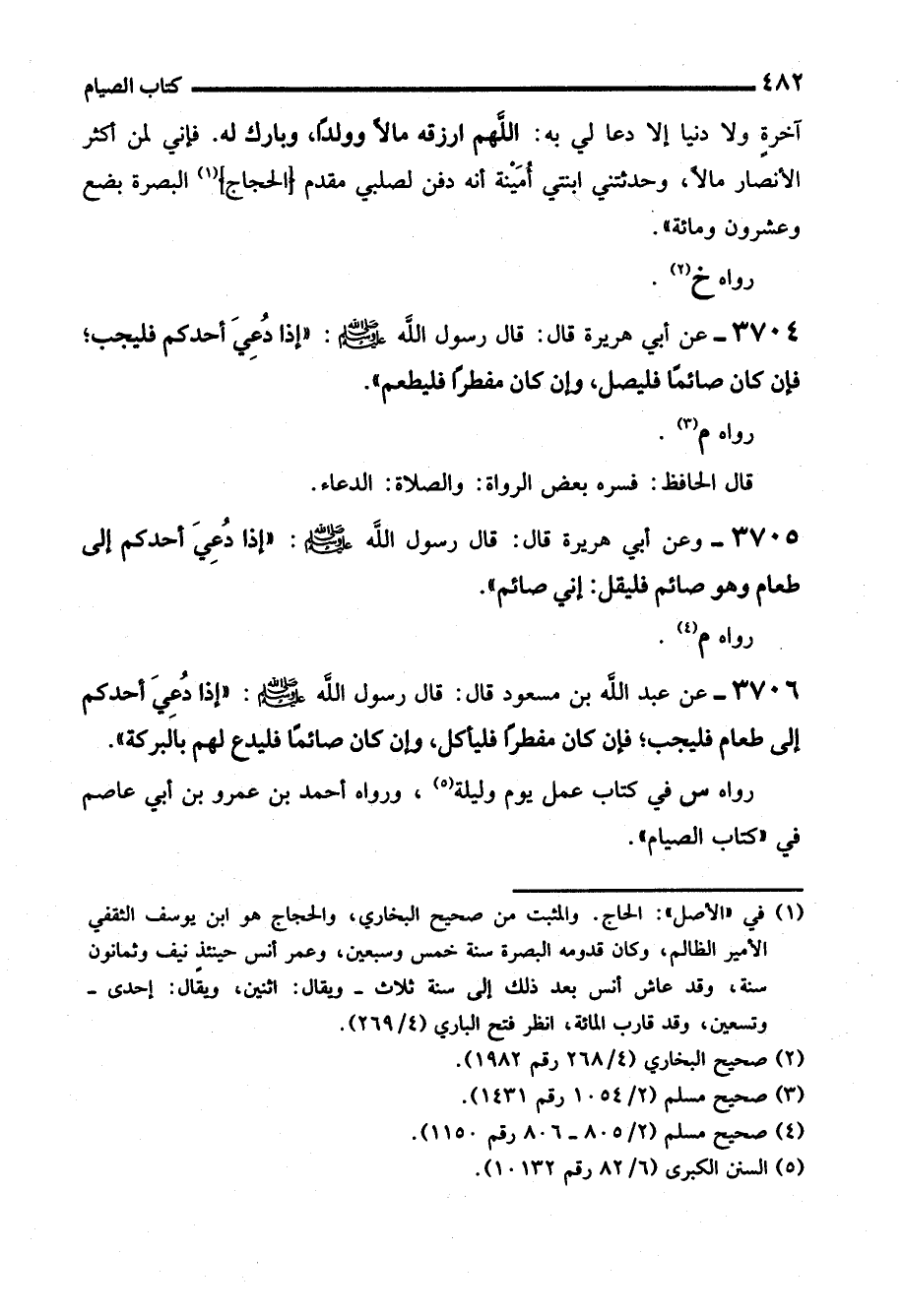 3705 - وعن أبي هريرة قال: قال رسول - صلى الله عليه وسلم -: "إذا دُعِيَ أحدكم إلى طعام وهو صائم فليقل: إني صائم".