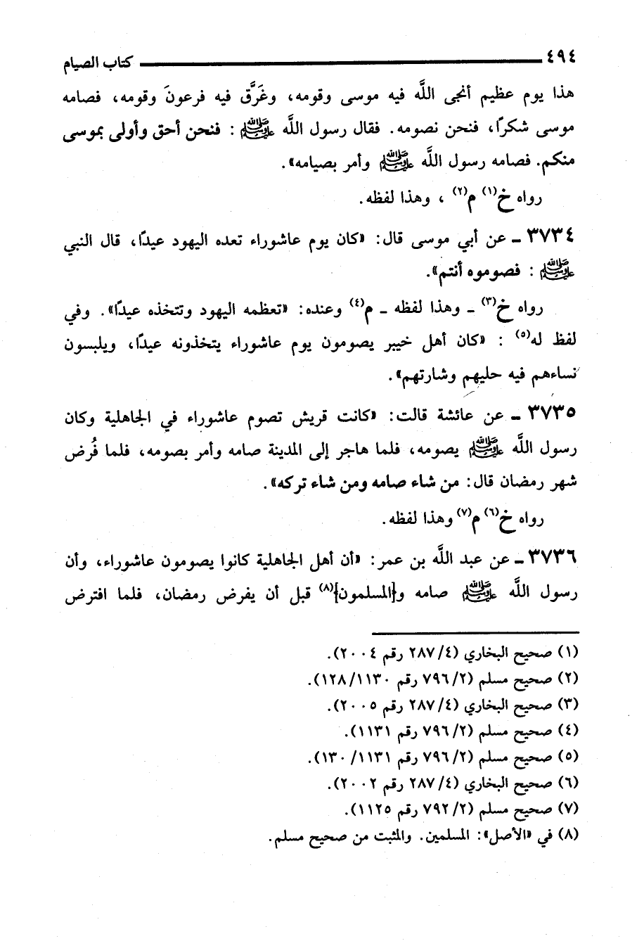 3734 - عن أبي موسى قال: "كان يوم عاشوراء تعده اليهود عيداً، قال النبي - صلى الله عليه وسلم -: فصوموه أنتم".