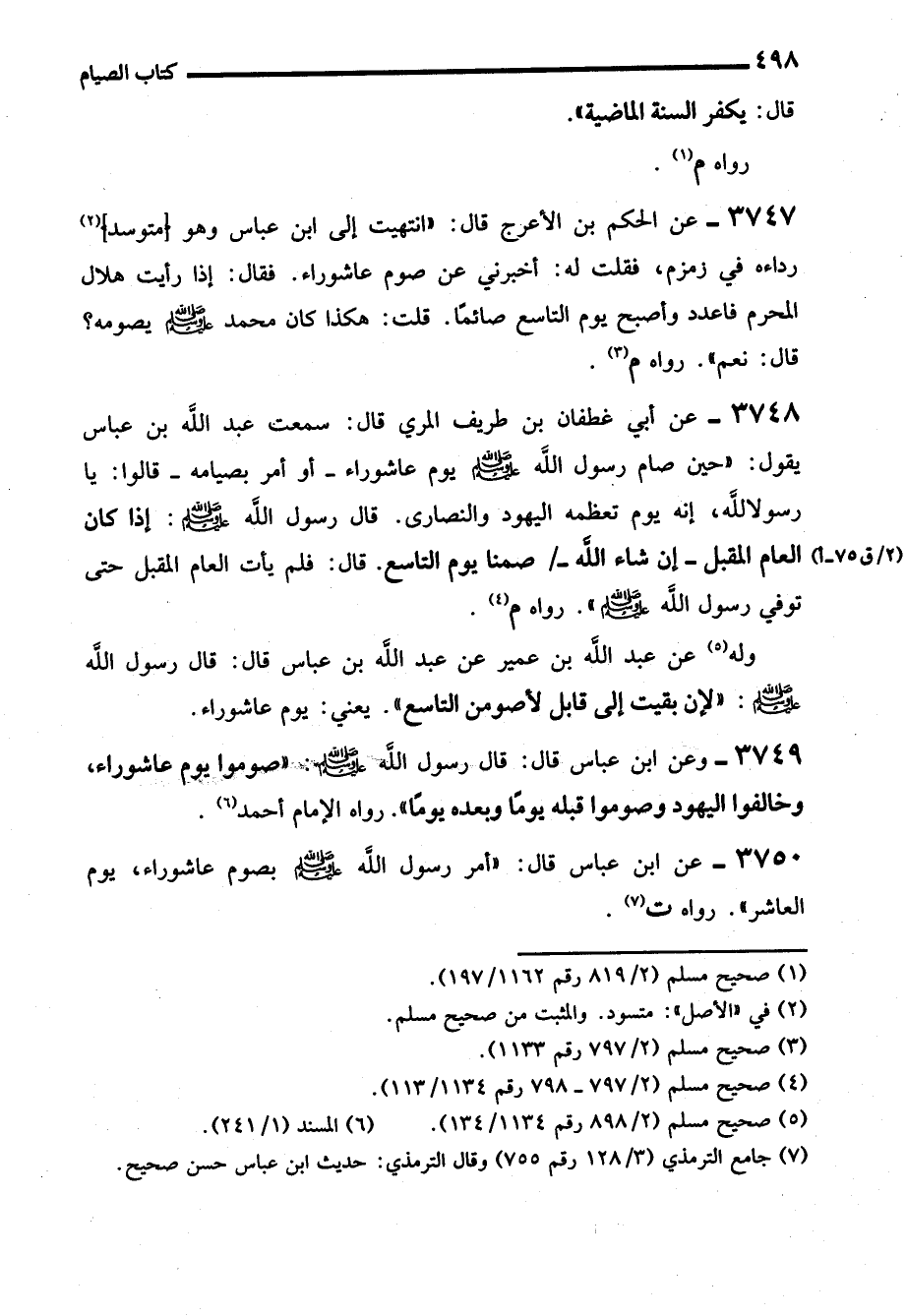 3750 - عن ابن عباس قال: "أمر رسول الله - صلى الله عليه وسلم - بصوم عاشوراء، يوم العاشر". رواه ت (¬7).