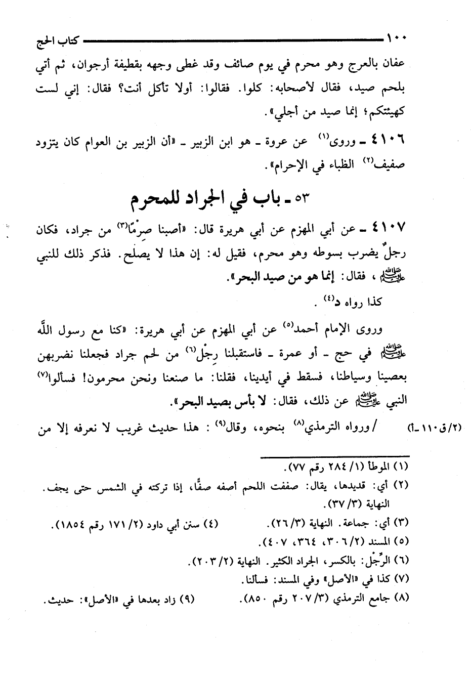4107 - عن أبي المهزم عن أبي هريرة قال: "أصبنا صِرْمًا (¬3) من جراد، فكان رجلٌ يضرب بسوطه وهو محرم، فقيل له: إن هذا لا يصلح. فذكر ذلك للنبي - صلى الله عليه وسلم -، فقال: إنما هو من صيد البحر".