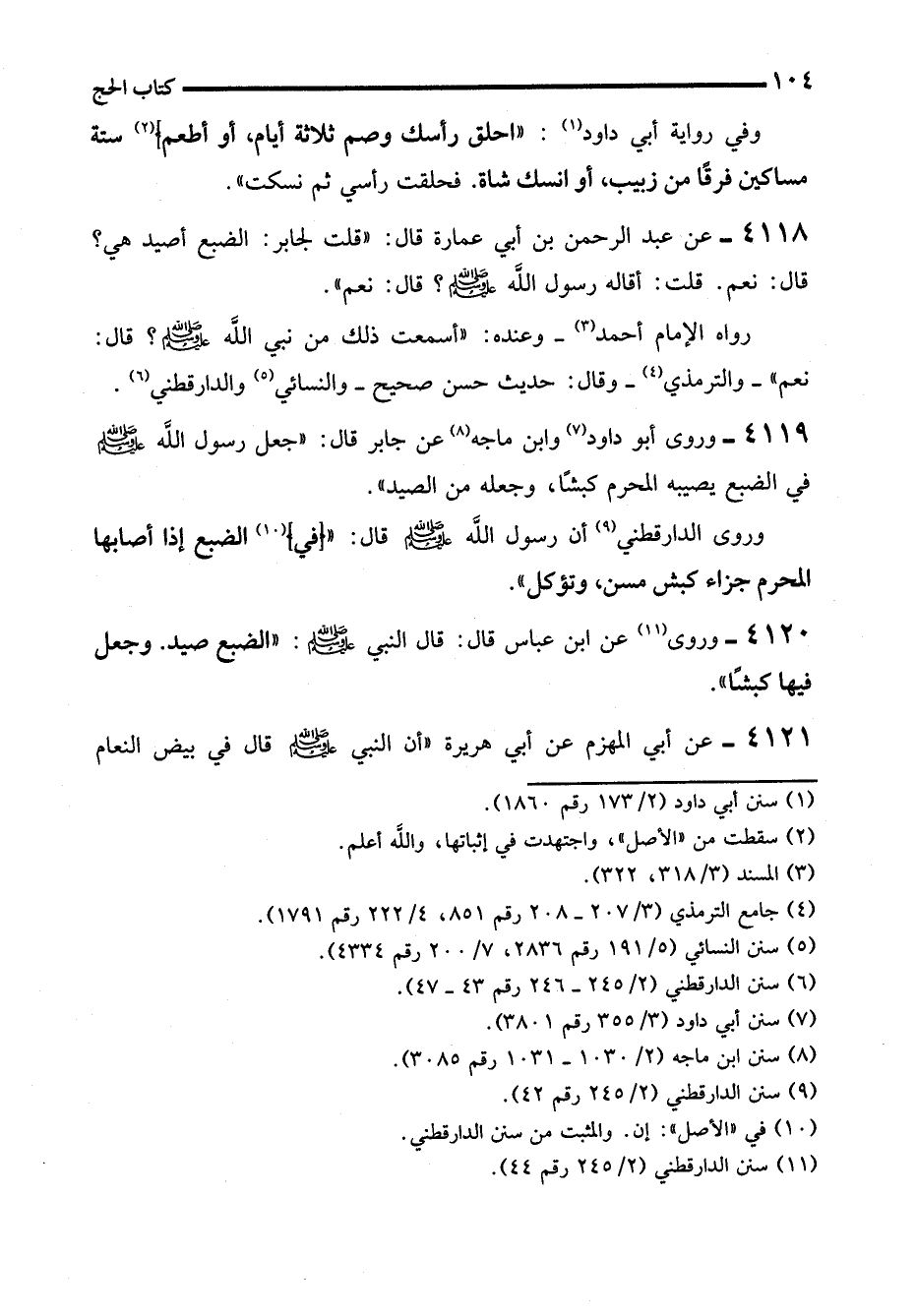 4119 - وروى أبو داود (¬7) وابن ماجه (¬8) عن جابر قال: "جعل رسول الله - صلى الله عليه وسلم - في الضبع يصيبه المحرم كبشًا، وجعله من الصيد".