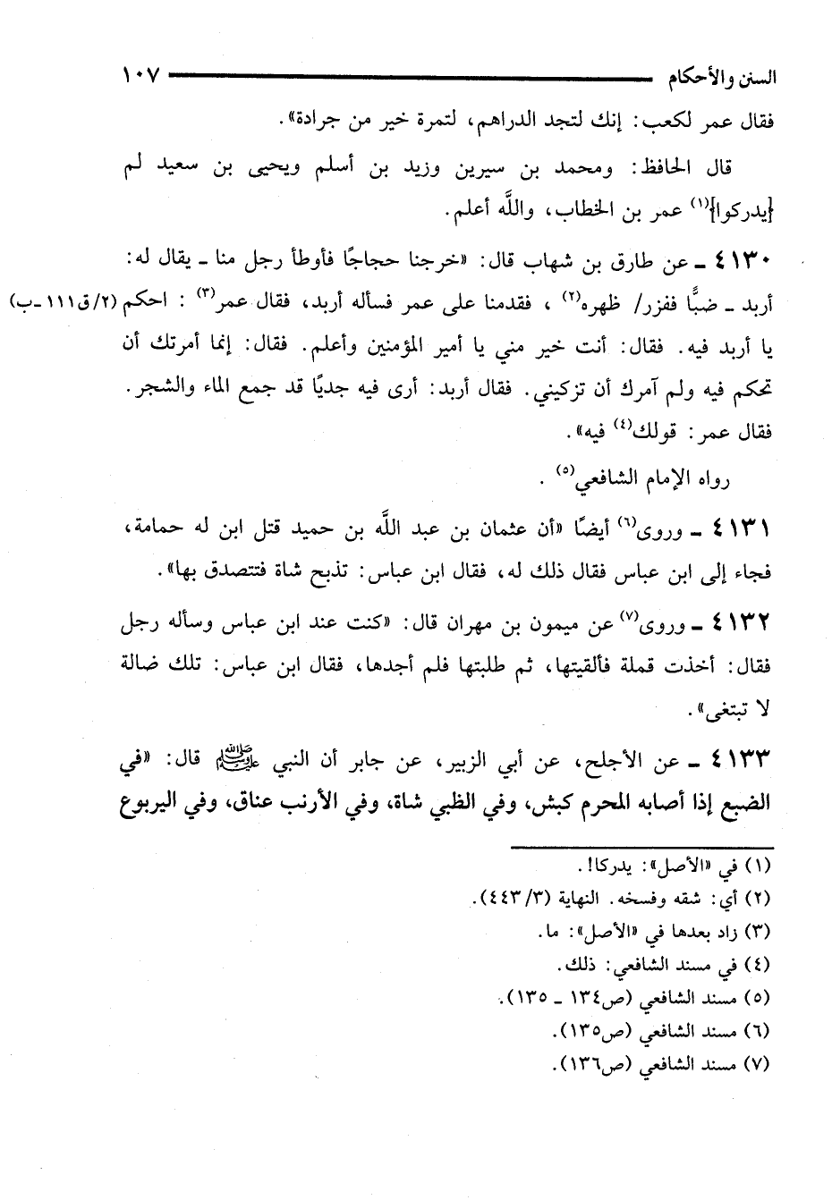 4130 - عن طارق بن شهاب قال: "خرجنا حجاجًا فأوطأ رجل منا -يقال له: أربد- ضبًّا ففزر ظهره (¬2)، فقدمنا على عمر فسأله أربد، فقال عمر (¬3): احكم يا أربد فيه. فقال: أنت خير مني يا أمير المؤمنين وأعلم. فقال: إنما أمرتك أن تحكم فيه ولم آمرك أن تزكيني. فقال أربد: أرى فيه جديًا قد جمع الماء والشجر. فقال عمر: قولك (¬4) فيه".