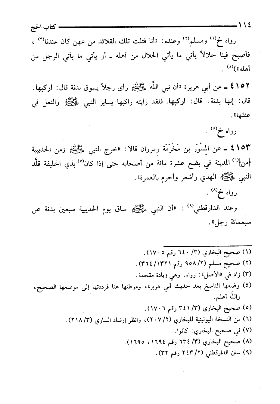 4152 - عن أبي هريرة "أن نبي الله - صلى الله عليه وسلم - رأى رجلاً يسوق بدنة قال: اركبها. قال: إنها بدنة. قال: اركبها. فلقد رأيته راكبها يساير النبي - صلى الله عليه وسلم - والنعل في عنقها".