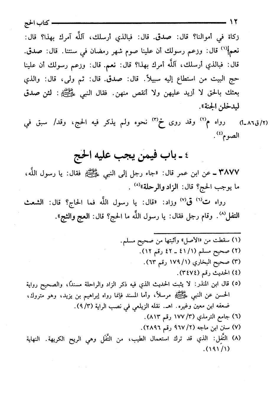 (¬5) قال ابن المنذر: لا يثبت الحديث الذي فيه ذكر الزاد والراحلة مسندًا، والصحيح رواية الحسن عن النبي - صلى الله عليه وسلم - مرسلاً، وأما المسند فإنما رواه إبراهيم بن يزيد، وهو متروك، ضعفه ابن معين وغيره. اهـ. نقله الزيلعي في نصب الراية (3/ 9).