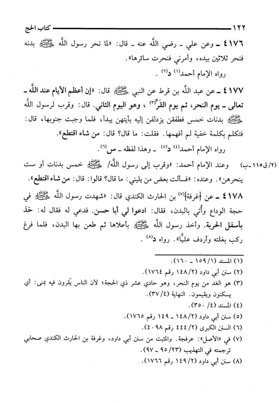 4178 - عن (غرفة) (¬7) بن الحارث الكندي قال: "شهدت رسول الله - صلى الله عليه وسلم - في حجة الوداع وأُتي بالبدن، فقال: ادعوا لي أبا حسن. فدعي له فقال له: خذ بأسفل الحربة. وأخذ رسول الله - صلى الله عليه وسلم - بأعلاها ثم طعن بها البدن، فلما فرغ ركب بغلته وأردف عليًّا". رواه د (¬8).
