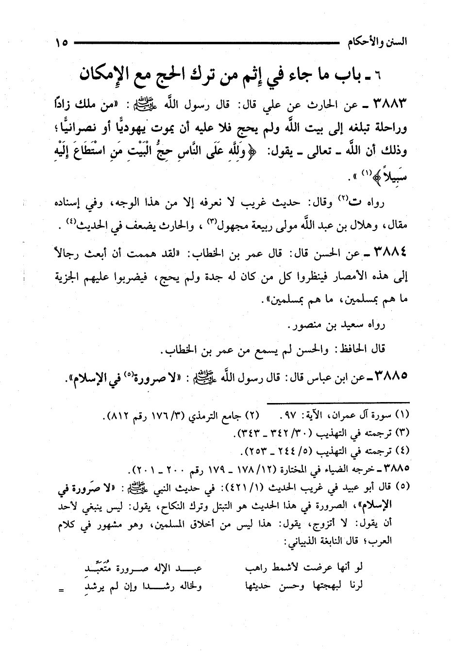3883 - عن الحارث عن علي قال: قال رسول الله - صلى الله عليه وسلم -: "من ملك زاداً وراحلة تبلغه إلى بيت الله ولم يحج فلا عليه أن يموت يهوديًّا أو نصرانيًّا؛ وذلك أن الله -تعالى- يقول: {وَلِلَّهِ عَلَى النَّاسِ حِجُّ الْبَيْتِ مَنِ اسْتَطَاعَ إِلَيْهِ سَبِيلًا} (¬1) ".
