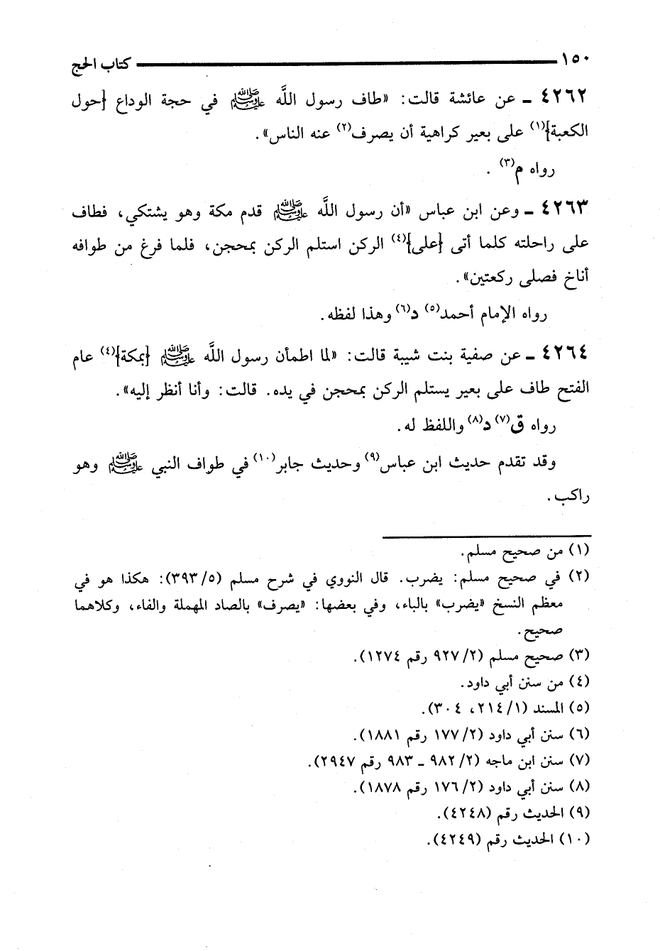 4264 - عن صفية بنت شيبة قالت: "لما اطمأن رسول الله - صلى الله عليه وسلم - (بمكة) (4) عام الفتح طاف على بعير يستلم الركن بمحجن في يده. قالت: وأنا انظر إليه".