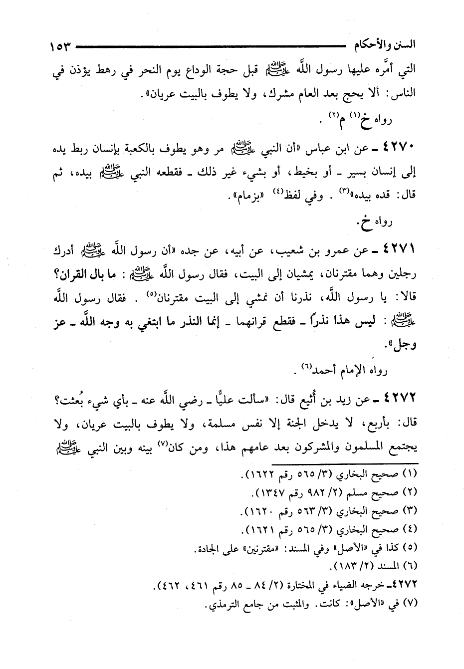 4270 - عن ابن عباس "أن النبي - صلى الله عليه وسلم - مر وهو يطوف بالكعبة بإنسان ربط يده إلى إنسان بسير -أو بخيط، أو بشيء غير ذلك- فقطعه النبي - صلى الله عليه وسلم - بيده، ثم قال: قده بيده" (¬3). وفي لفظ (¬4) "بزمام".