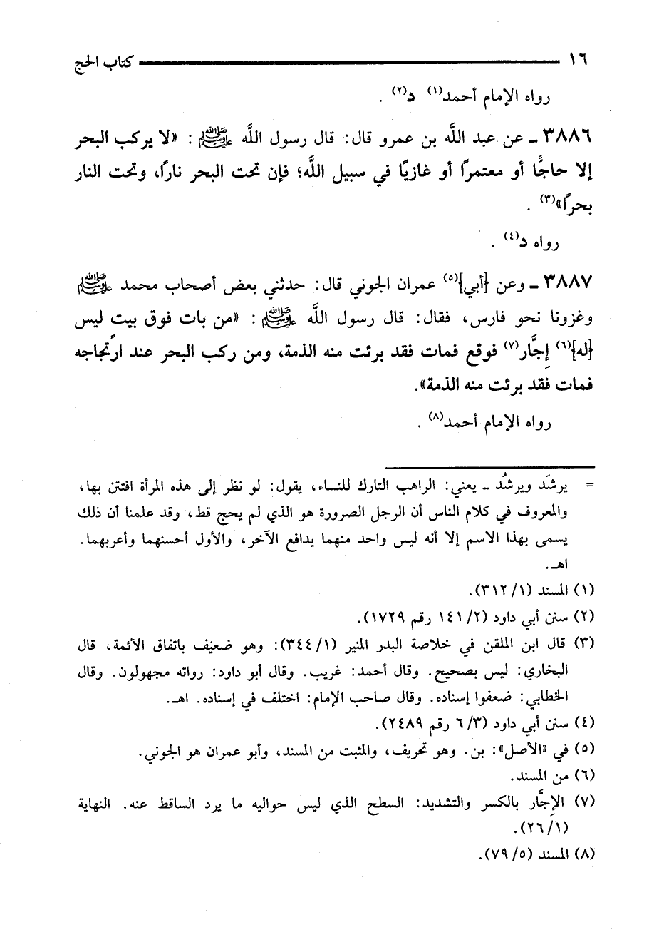 3887 - وعن (أبي) (¬5) عمران الجوني قال: حدثني بعض أصحاب محمد - صلى الله عليه وسلم - وغزونا نحو فارس، فقال: قال رسول الله - صلى الله عليه وسلم -: "من بات فوق بيت ليس (له) (¬6) إِجَّار (¬7) فوقع فمات فقد برئت منه الذمة، ومن ركب البحر عند ارتجاجه فمات فقد برئت منه الذمة".