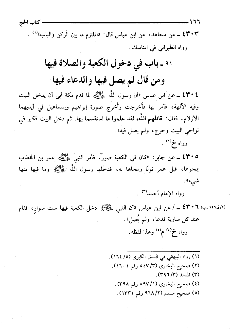 4306 - عن ابن عباس "أن النبي - صلى الله عليه وسلم - دخل الكعبة فيها ست سوارٍ، فقام عند كل سارية فدعا، ولم يُصل".