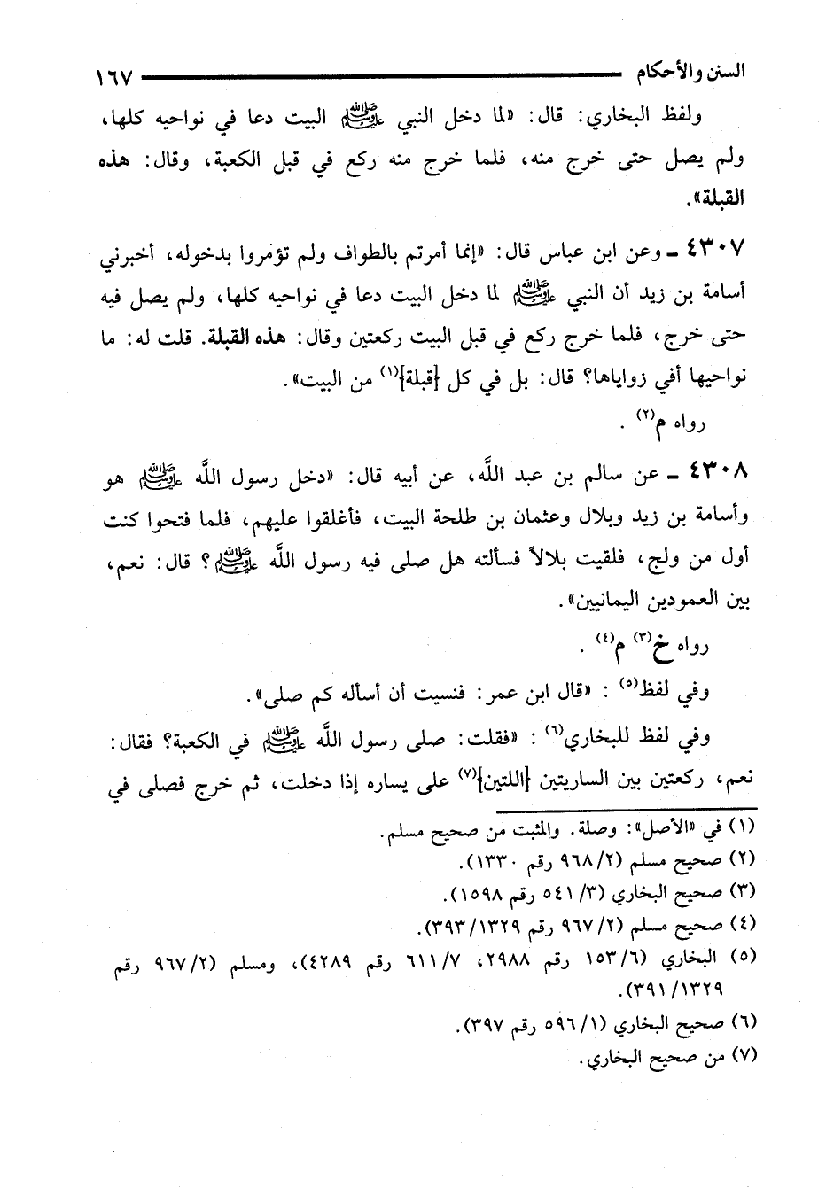 4308 - عن سالم بن عبد الله، عن أبيه قال: "دخل رسول الله - صلى الله عليه وسلم - هو وأسامة بن زيد وبلال وعثمان بن طلحة البيت، فأغلقوا عليهم، فلما فتحوا كنت أول من ولج، فلقيت بلالاً فسألته هل صلى فيه رسول الله - صلى الله عليه وسلم -؟ قال: نعم، بين العمودين اليمانيين".