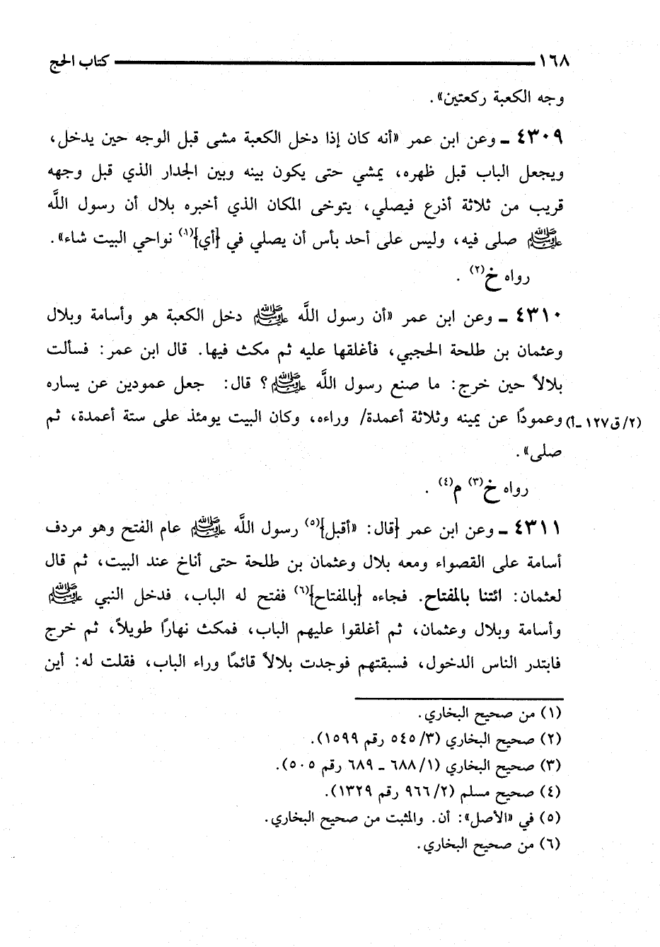 4310 - وعن ابن عمر "أن رسول الله - صلى الله عليه وسلم - دخل الكعبة هو وأسامة وبلال وعثمان بن طلحة الحجبي، فأغلقها عليه ثم مكث فيها. قال ابن عمر: فسألت بلالاً حين خرج: ما صنع رسول الله - صلى الله عليه وسلم -؟ قال: جعل عمودين عن يساره وعمودًا عن يمينه وثلاثة أعمدة وراءه، وكان البيت يومئذ على ستة أعمدة، ثم صلى".