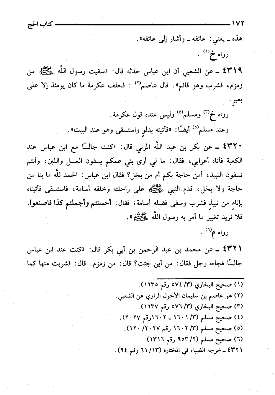 4319 - عن الشعبي أن ابن عباس حدثه قال: "سقيت رسول الله - صلى الله عليه وسلم - من زمزم، فشرب وهو قائم". قال عاصم (¬2): فحلف عكرمة ما كان يومئذ إلا على بعيرٍ.