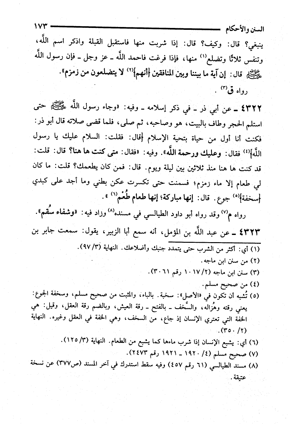 4322 - عن أبي ذر -في ذكر إسلامه- وفيه: "وجاء رسول الله - صلى الله عليه وسلم - حتى استلم الحجر وطاف بالبيت، هو وصاحبه، ثم صلى، فلما قضى صلاته قال أبو ذر: فكنت أنا أول من حياه بتحية الإسلام (قال: فقلت: السلام عليك يا رسول الله) (¬4) فقال: وعليك ورحمة الله". وفيه: "فقال: متى كنت ها هنا؟ قال: قلت: قد كنت ها هنا منذ ثلاثين بين ليلة ويوم. قال: فمن كان يطعمك؟ قلت: ما كان لي طعام إلا ماء زمزم؟ فسمنت حتى تكسرت عكن بطني وما أجد على كبدي (سخفة) (¬5) جوع. قال: إنها مباركة؛ إنها طعام طُعْم (¬6).