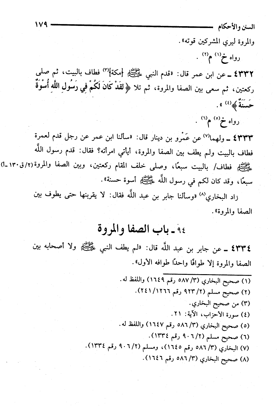 4332 - عن ابن عمر قال: "قدم النبي - صلى الله عليه وسلم - (مكة) (¬3) فطاف بالبيت، ثم صلى ركعتين، ثم سعى بين الصفا والمروة، ثم تلا {لَقَدْ كَانَ لَكُمْ فِيهِمْ أُسْوَةٌ حَسَنَةٌ} (¬4) ".