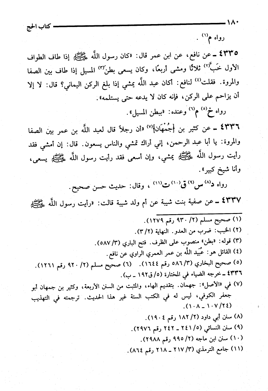 4336 - عن كثير بن (جُمْهَان) (¬7) "أن رجلاً قال لعبد الله بن عمر بين الصفا والمروة: يا أبا عبد الرحمن، إني أراك تمشي والناس يسعون. قال: إن أمشي فقد رأيت رسول الله - صلى الله عليه وسلم - يمشي، وإن أسعى فقد رأيت رسول الله - صلى الله عليه وسلم - يسعى، وأنا شيخ كبير".