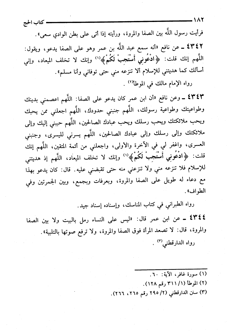 4343 - وعن نافع "أن ابن عمر كان يدعو على الصفا: اللَّهم اعصمني بدينك وطواعيتك وطواعية رسولك، اللهم جنبني حدودك، اللهم اجعلني ممن يحبك ويحب ملائكتك ويحب رسلك ويحب عبادك الصالحين، اللَّهم حببني إليك وإلى ملائكتك وإلى رسلك وإلى عبادك الصالحين، اللَّهم يسرني لليسرى، وجنبني العسرى، واغفر لي في الآخرة والأولى، واجعلني من أئمة المتقين، اللَّهم إنك قلت: {ادْعُونِي أَسْتَجِبْ لَكُمْ} (1) وإنك لا تخلف الميعاد، اللَّهم إذ هديتني للإسلام فلا تنزعه مني ولا تنزعني منه حتى تقبضني عليه. قال: كان يدعو بهذا مع دعاء له طويل على الصفا والمروة، وبعرفات وبجمع، وبين الجمرتين وفي الطواف".