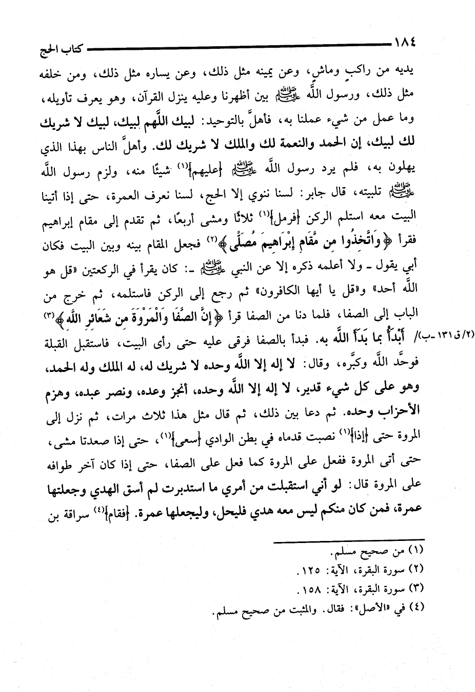 يديه من راكبٍ وماشٍ، وعن يمينه مثل ذلك، وعن يساره مثل ذلك، ومن خلفه مثل ذلك، ورسول الله - صلى الله عليه وسلم - بين أظهرنا وعليه ينزل القرآن، وهو يعرف تأويله، وما عمل من شيء عملنا به، فأهلَّ بالتوحيد: لبيك اللَّهم لبيك، لبيك لا شريك لك لبيك، إن الحمد والنعمة لك والملك لا شريك لك. وأهلَّ الناس بهذا الذي يهلون به، فلم يرد رسول الله - صلى الله عليه وسلم - (عليهم) (¬1) - شيئاً منه، ولزم رسول الله - صلى الله عليه وسلم - تلبيته، قال جابر: لسنا ننوي إلا الحج، لسنا نعرف العمرة، حتى إذا أتينا البيت معه استلم الركن (فرمل) (1) ثلاثاً ومشى أربعاً، ثم تقدم إلى مقام إبراهيم فقرأ {وَاتَّخِذُوا مِنْ مَقَامِ إِبْرَاهِيمَ مُصَلًّى} (¬2) فجعل المقام بينه وبين البيت فكان أبي يقول -ولا أعلمه ذكره إلا عن النبي - صلى الله عليه وسلم -: كان يقرأ في الركعتين "قل هو الله أحد" و"قل يا أيها الكافرون" ثم رجع إلى الركن فاستلمه، ثم خرج من الباب إلى الصفا، فلما دنا من الصفا قرأ {إِنَّ الصَّفَا وَالْمَرْوَةَ مِنْ شَعَائِرِ اللَّهِ} (¬3) أبْدَأُ بما بَدَأَ الله به. فبدأ بالصفا فرقى عليه حتى رأى البيت، فاستقبل القبلة فوحَّد الله وكبَّره، وقال: لا إله إلا الله وحده لا شريك له، له الملك وله الحمد، وهو على كل شيء قدير، لا إله إلا الله وحده، أنجز وعده، ونصر عبده، وهزم الأحزاب وحده. ثم دعا بين ذلك، ثم قال مثل هذا ثلاث مرات، ثم نزل إلى المروة حتى (إذا) (1) نصبت قدماه في بطن الوادي (سعى) (1)، حتى إذا صعدتا مشى، حتى أتى المروة ففعل على المروة كما فعل على الصفا، حتى إذا كان آخر طوافه على المروة قال: لو أني استقبلت من أمري ما استدبرت لم أسق الهدي وجعلتها عمرة، فمن كان منكم ليس معه هدي فليحل، وليجعلها عمرة. (فقام) (¬4) سراقة بن