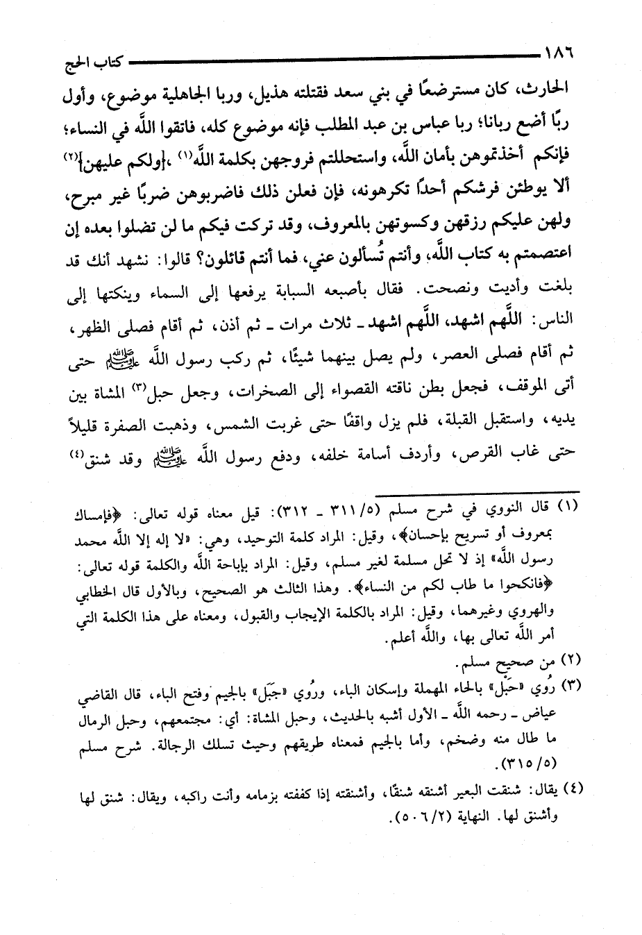 الحارث، كان مسترضعاً في بني سعد فقتلته هذيل، وربا الجاهلية موضوع، وأول ربًا أضع ربانا؛ ربا عباس بن عبد المطلب فإنه موضوع كله، فاتقوا الله في النساء؛ فإنكم أخذتموهن بأمان الله، واستحللتم فروجهن بكلمة الله (¬1)، (ولكم عليهن) (¬2) ألا يوطئن فرشكم أحداً تكرهونه، فإن فعلن ذلك فاضربوهن ضرباً غير مبرح، ولهن عليكم رزقهن وكسوتهن بالمعروف، وقد تركت فيكم ما لن تضلوا بعده إن اعتصمتم به كتاب الله وأنتم تُسألون عني، فما أنتم قائلون؟ قالوا: نشهد أنك قد بلغت وأديت ونصحت. فقال بأصبعه السبابة يرفعها إلى السماء وينكتها إلى الناس: اللهم اشهد، اللهم اشهد -ثلاث مرات- ثم أذن، ثم أقام فصلى الظهر، ثم أقام فصلى العصر، ولم يصل بينهما شيئًا، ثم ركب رسول الله - صلى الله عليه وسلم - حتى أتى الموقف، فجعل بطن ناقته القصواء إلى الصخرات، وجعل حبل (¬3) المشاة بين يديه، واستقبل القبلة، فلم يزل واقفًا حتى غربت الشمس، وذهبت الصفرة قليلاً حتى غاب القرص، وأردف أسامة خلفه، ودفع رسول الله - صلى الله عليه وسلم - وقد شنق (¬4)