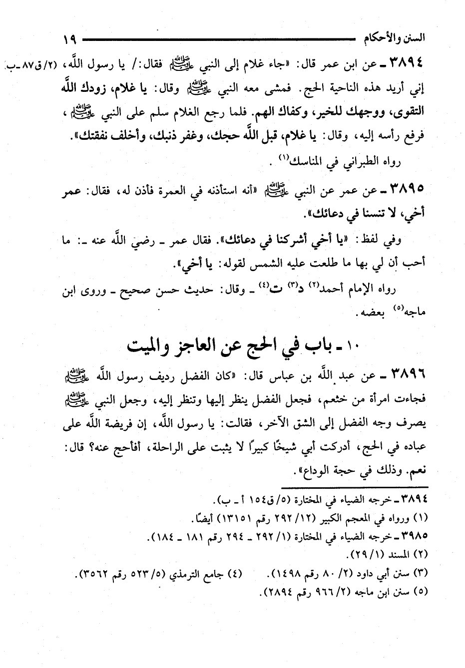 3894 - عن ابن عمر قال: "جاء غلام إلى النبي - صلى الله عليه وسلم - فقال: يا رسول الله، إني أريد هذه الناحية الحج. فمشى معه النبي - صلى الله عليه وسلم - وقال: يا غلام، زودك الله التقوى، ووجهك للخير، وكفاك الهم. فلما رجع الغلام سلم على النبي - صلى الله عليه وسلم - فرفع رأسه إليه، وقال: يا غلام، قبل الله حجك، وغفر ذنبك، وأخلف نفقتك".
