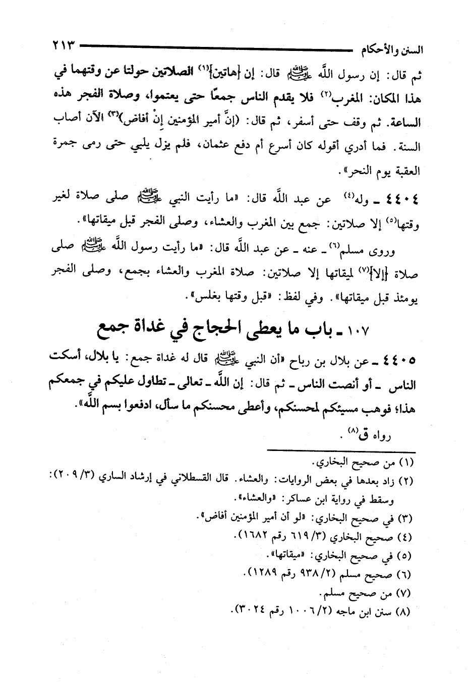 4405 - عن بلال بن رباح: "أن النبي - صلى الله عليه وسلم - قال له غداة جمع: يا بلال، أسكت الناس -أو أنصت الناس- ثم قال: إن الله -تعالى- تطاول عليكم في جمعكم هذا؛ فوهب مسيئكم لمحسنكم، وأعطى محسنكم ما سأل، ادفعوا بسم الله".