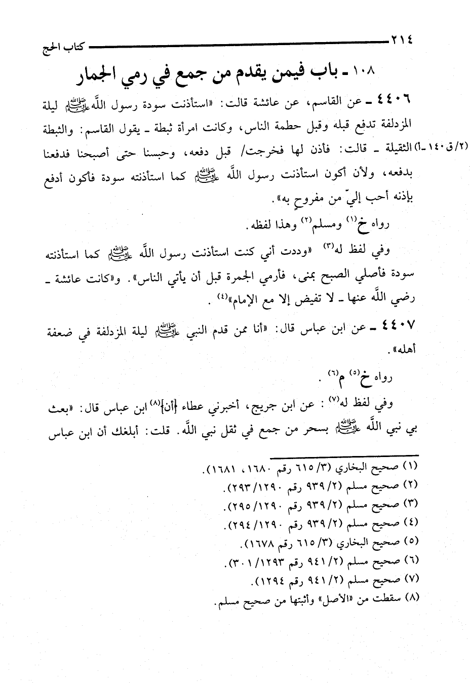4406 - عن القاسم، عن عائشة قالت: "استأذنت سودة رسول الله - صلى الله عليه وسلم - ليلة المزدلفة تدفع قبله وقبل حطمة الناس، وكانت امرأة ثبطة -يقول القاسم: والثبطة الثقيلة- قالت: فأذن لها فخرجت قبل دفعه، وحبسنا حتى أصبحنا فدفعنا بدفعه، ولأن أكون استأذنت رسول الله - صلى الله عليه وسلم - كما استأذنته سودة فأكون أدفع بإذنه أحب إليّ من مفروحٍ به".