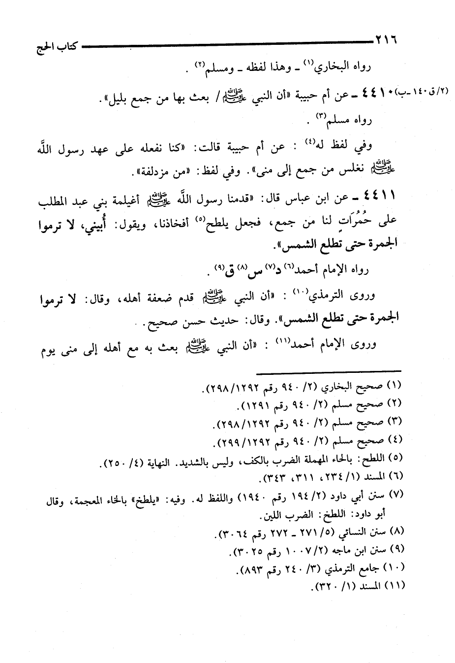 4411 - عن ابن عباس قال: "قدمنا رسول الله - صلى الله عليه وسلم - أغيلمة بني عبد المطلب على حُمُرَاتٍ لنا من جمع، فجعل يلطح (¬5) أفخاذنا، ويقول: أُبيني، لا ترموا الجمرة حتى تطلع الشمس".