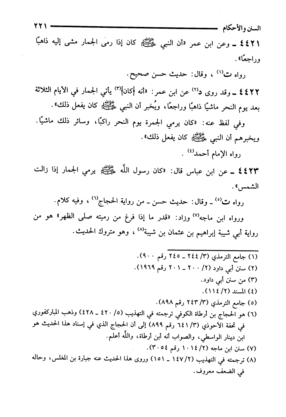 4421 - وعن ابن عمر "أن النبي - صلى الله عليه وسلم - كان إذا رمى الجمار مشى إليه ذاهبًا وراجعًا".