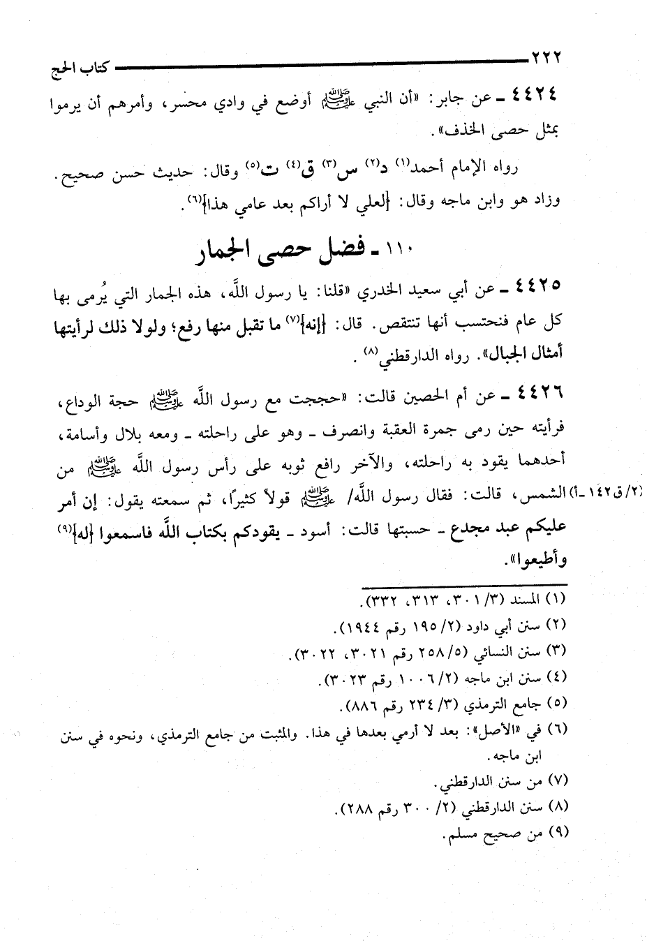 4425 - عن أبي سعيد الخدري "قلنا: يا رسول الله، هذه الجمار التي يُرمى بها كل عام فنحتسب أنها تنتقص. قال: (إنه) (¬7) ما تقبل منها رفع؛ ولولا ذلك لرأيتها أمثال الجبال". رواه الدارقطني (¬8).
