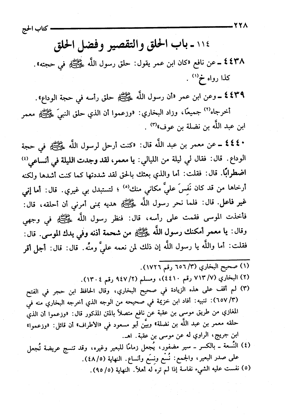 (¬3) لم أقف على هذه الزيادة في صحيح البخاري، وقال الحافظ ابن حجر في الفتح (3/ 657): تنبيه: أفاد ابن خزيمة في صحيحه من الوجه الذي أخرجه البخاري منه في المغاري من طريق موسى بن عقبة عن نافع متصلاً بالمتن المذكور قال: "وزعموا أن الذي حلقه معمر بن عبد الله بن نضلة" وبيَّن أبو مسعود في "الأطراف" أن قائل: "وزعموا" ابن جريج، الراوي له عن موسى بن عقبة. اهـ.